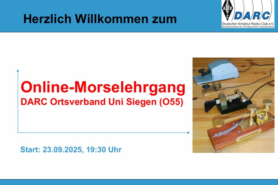 Am heutigen Dienstag, den 23.9.2025, ist unser erster Online-Morsekurs mit überwältigender Resonanz gestartet. Neben den 28 angemeldeten Teilnehmern konnten im Laufe des Abends weitere 16 Gäste begrüßt werden, die die Gelegenheit zum spontanen „Reinschnuppern“ genutzt haben. Der Lehrgang möchte über die DARC-Onlineplattform „treff.darc.de“ bis zum Jahresende die wesentlichen Morsezeichen für den Amateurfunk vermitteln im Hören und Geben.Weiterlesen »O55-Online-Morselehrgang erfolgreich gestartet