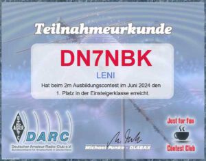 Den 2m-Ausbildungscontest vom Juni 2024 gewann ich, Leni, unter dem Rufzeichen DN7NBK. Dies war das erst Mal für mich, selbst CQ zu rufen. Aber es gab direkt Erfolg. Mit 1047 Punkten schaffte ich es auf den ersten Platz.