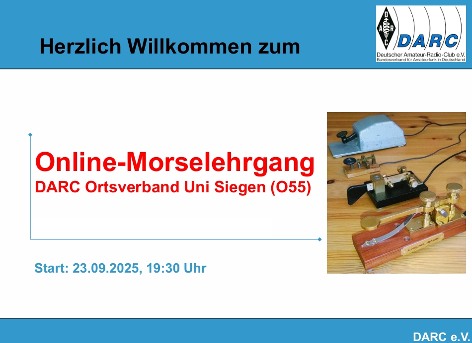 Am heutigen Dienstag, den 23.9.2025, ist unser erster Online-Morsekurs mit überwältigender Resonanz gestartet. Neben den 28 angemeldeten Teilnehmern konnten im Laufe des Abends weitere 16 Gäste begrüßt werden, die die Gelegenheit zum spontanen „Reinschnuppern“ genutzt haben. Der Lehrgang möchte über die DARC-Onlineplattform „treff.darc.de“ bis zum Jahresende die wesentlichen Morsezeichen für den Amateurfunk vermitteln im Hören und Geben.